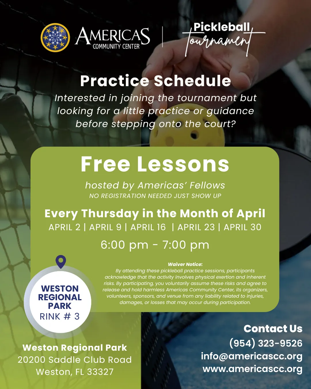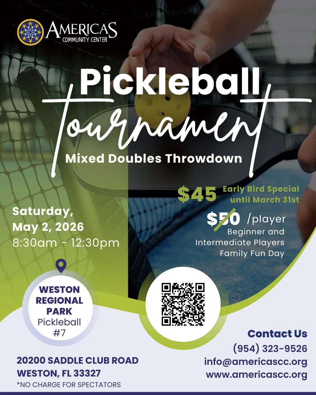 On Saturday, May 2, 2026, we will host our Community Pickleball Tournament at Weston Regional Park, a fun, high-energy day designed for beginners and intermediate players, where families, local businesses, and community leaders can connect both on and off the court.